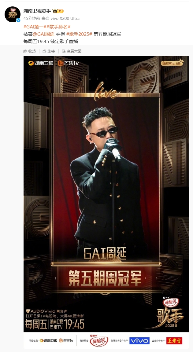 6月13日生讯网,《歌手2025》第五期播出,GAI 周延第一,者来女揭榜米奇·盖顿成功,唐汉霄揭榜陈楚生失败,卫兰淘汰。具体排名如下: