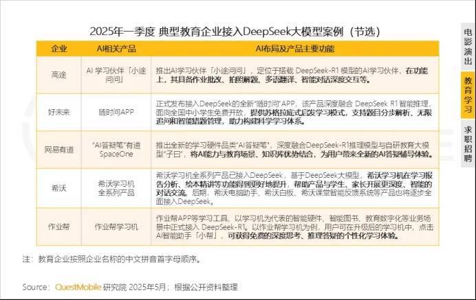 截至2025年5月,包括高途、好未来、网易有道等在内的典型教育企业纷纷接入DeepSeek大模型,加速数字化转型。